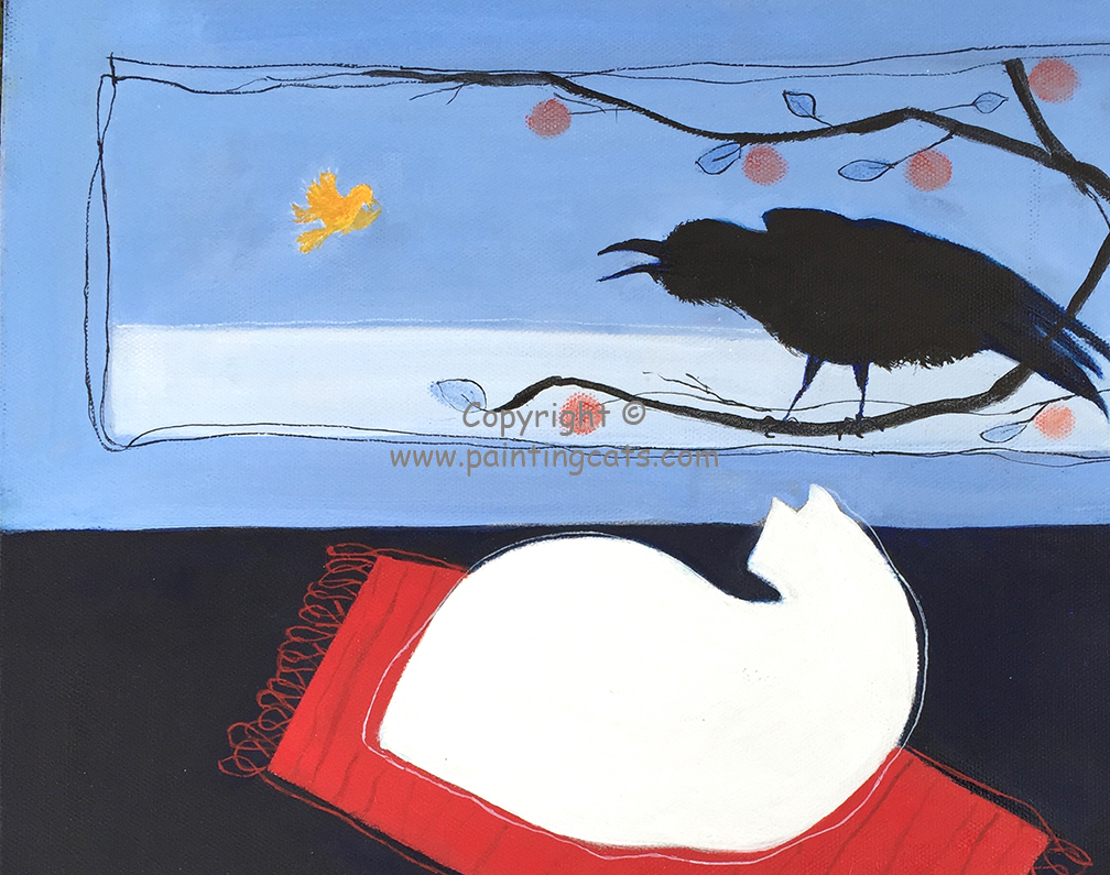 My art explores and celebrates all cats – realistically, abstractly and whimsically. Cats present endless possibilities for artistic expression, from a thought-provoking portrait to silly, make-you-laugh-till-you-cry antics. Painting whimsical cats led me to painting whimsical dogs and ravens. It is the silliness of these paintings that can make you smile.